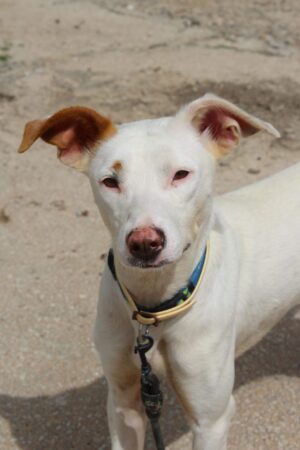 Un poco tímida al principio. Me ayuda mucho la presencia de otros perros sociables, me siento relajada en su presencia y a veces me arranco a jugar con ellos.